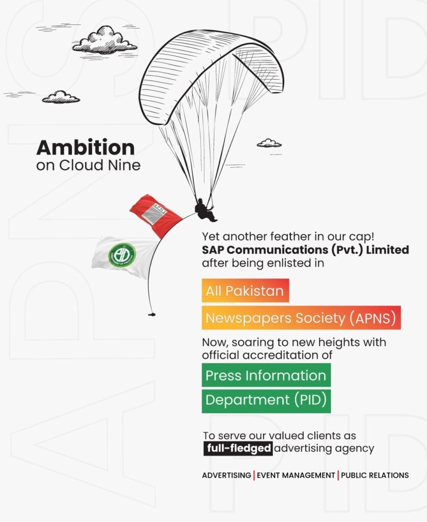 We are proud to announce that SAP Communications has been officially enlisted in the All Pakistan Newspapers Society (APNS) and accredited by the Press Information Department (PID) — marking our growth as a full-fledged advertising agency authorized to serve both public and private sector clients across Pakistan.